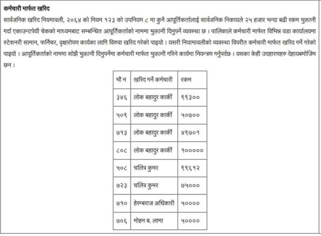 प्रतिवेदनको क्रमसंख्या ३४ मा कर्मचारी मार्पmत खरिदको उदाहरणका लागि लोकबहादुर कार्की , चलित्र कुमर , हेरम्ब अधिकारी , मोहन बहादुर लामाले सोभैm खरिद गरेको उल्लेख छ । त्यस्तै क्रमसंख्या ३५ मा ह्युम पाईप खरिद शिर्षकमा महालेखाले ३३ लाख ८७ हजार ८ सय ५८ बेरुजु देखाएको छ ।