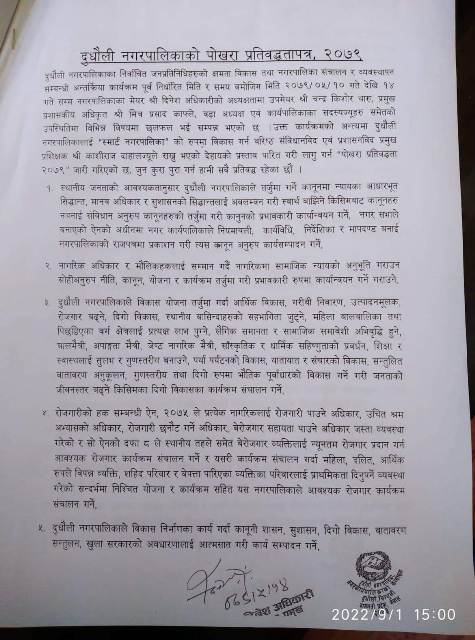 दुधौली /पोखरामा तालिम आयोजान गरेपछी चर्चामा आएको सिन्धुलीको दुधौली नगरपालिकाको प्रमुख सहितको टोलीलले दुधौलीलाई पोखरा जस्तो बनाउने उद्येश्य रहेको जनाएको छ । पोखरा भ्रमणबाट फर्किएपछी भ्रमण टोलीले प्रतिवद्धता पत्र नै सार्वजनिक गरेको छ ।
