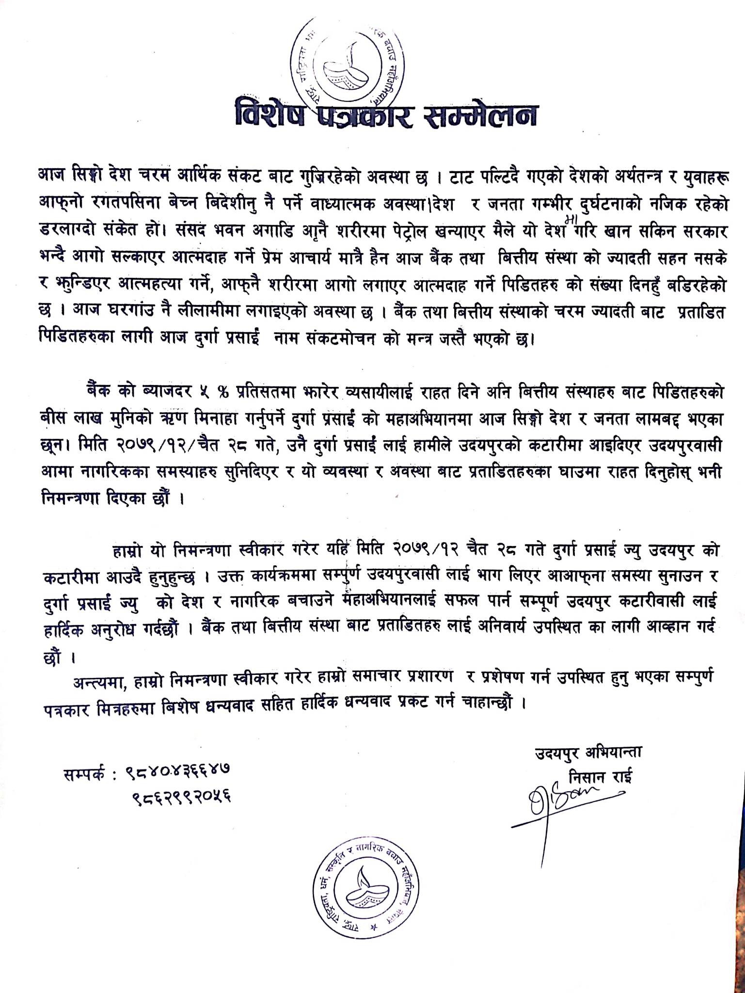 अभियन्ता राईले कार्यक्रममा देशका वित्तीय संस्थाहरुको ज्यादतीका कारण आम नागरिकमा बढ्दै गइरहेको गरीबीले कसरी देशको आर्थिक तथा सामाजिक संरचना नै ध्वस्त बन्दै गइरहेको छ, त्यसको बारेमा प्रमुख अतिथिले अब चाल्नुपर्ने कदम र समाधानबारे प्रष्ट पार्नुहुने बताउनुभयो ।पत्रकार सम्मेलन गर्दै वैंकको व्याजदर ५ प्रतिशतमा झारेर व्यवसायीहरुलाई राहत दिने तथा वित्तीय संस्थाहरुबाट पीडितहरुलाई २० लाख ऋण मिनाहा गर्नुपर्ने प्रसाईको अभियानमा देश र जनता लामवद्ध भएको अवस्थामा कटारीमा कार्यक्रम गर्न लागिएको उल्लेख गरिएको छ ।