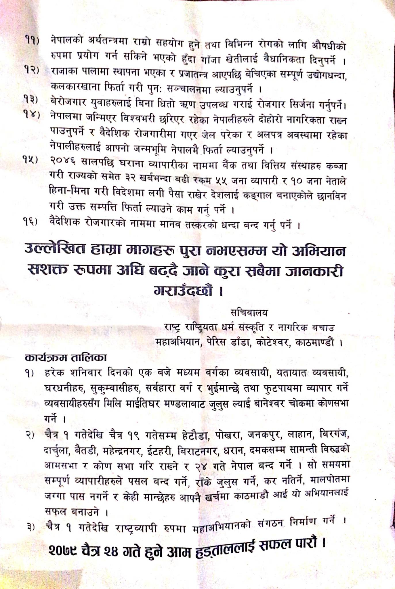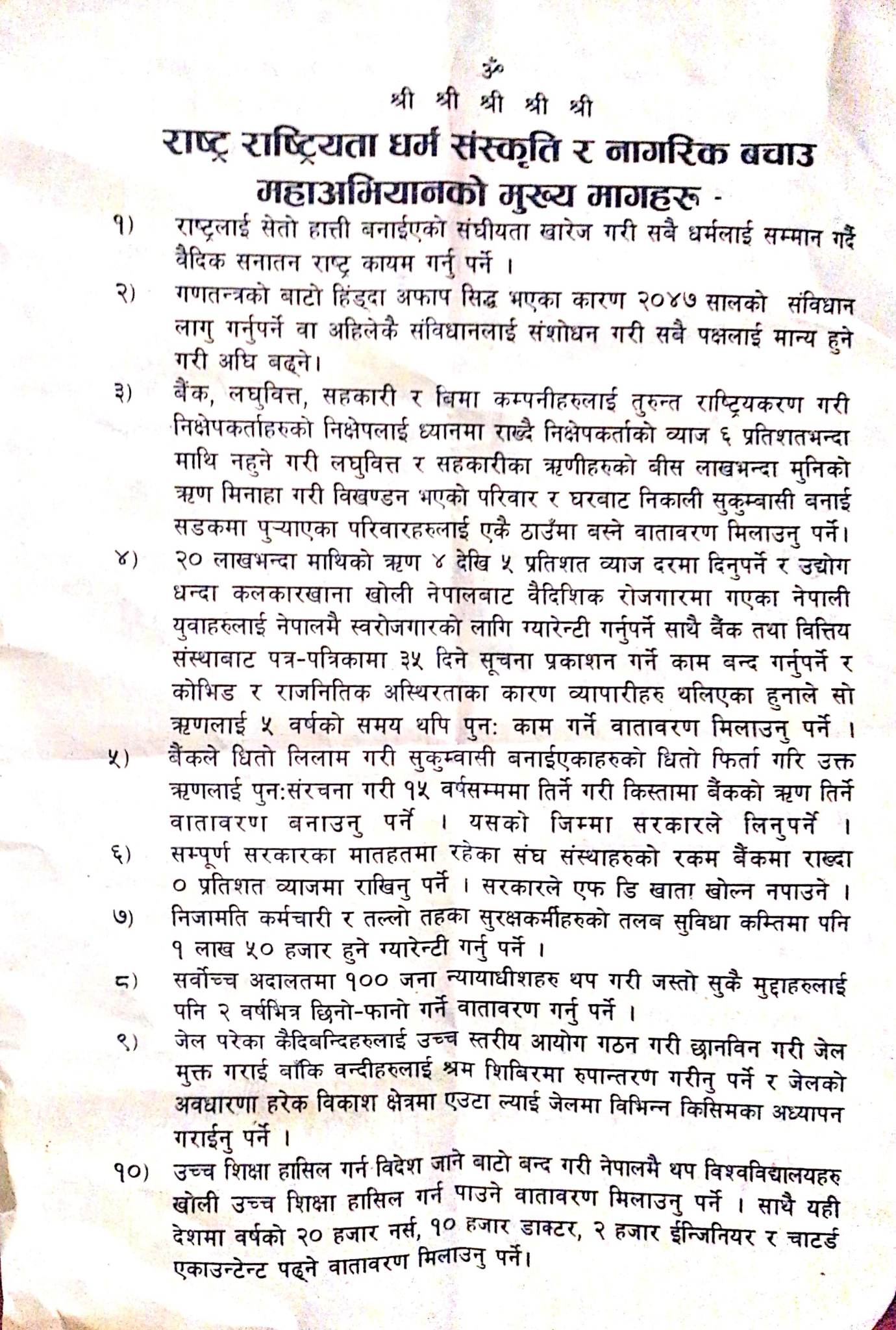 अहिले धेरै नेपालीले वैंकको व्याज तिर्न सक्ने अवस्था नभएको साथै लघुवीत्तले महिलाहरु पीडित भएर जंगल पस्नुपर्ने वाध्यता आईसकेको बताउनुभयो । २० लाख मुनीको ऋण मिनाहा तथा वैंकको व्याजदर ५ प्रतिशतमा झार्नुपर्ने आप्mनो माग भएकाले यहि माग पुरा गर्न हडताल गर्नुपर्ने बताउनुभयो ।