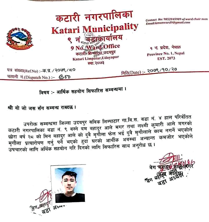 कटारी / दुवै मृगौला फेल भएका कटारीका एक युवाले आफुलाई बचाईदिन आग्रह गरेको छन् । घरमा आर्थिक अवस्था नाजुक भएका कारण उनलाई उपचारमा सहज नभएको भन्दै अन्यत्र हसयोगको अपिल गरिएको हो ।