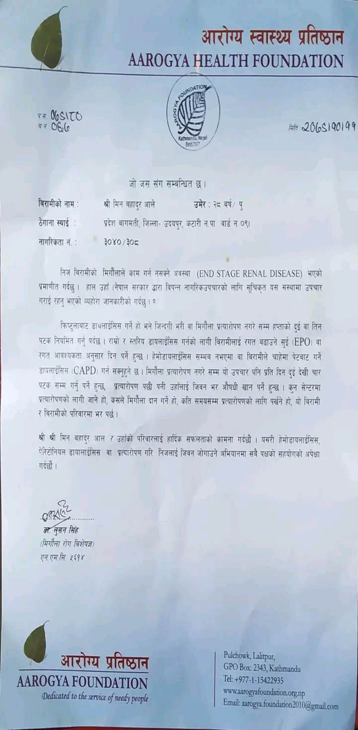 आरोग्य स्वास्थ्य प्रतिष्ठानले मगरको दुवै मृगौला काम नलाग्ने पुष्टी गरेको छ । त्यसका लागि प्रत्यारोन नभए सम्म हप्ताको तिन पटक सम्म डायलाईसिस गर्नु पर्ने उल्लेख गरेको छ । थप स्तरीय डायलासिसको लागि त झन रगतहरुको सम्म आवश्यक पर्ने जनाईएको छ । सदावाहर डायलाईसिस गरी बचाउन असम्भव हुने हुँदा उनलाई आर्थिक सहयोग र मृगौला दानको लागि समेत आरोग्यले पत्रमा अनुरोध गरेको छ । मगरको परिवार खेति किसानी गर्दै आईरहेका छन् । घरमा गतिलो आर्थिक स्रोत नहुँदा ५० लाख बरावरको रकम उनिहरुलाई सपना जस्तो भैरहेको छ । परिवारले सम्पूर्ण संघ संस्था, मनकारी ब्यक्तित्व, सरकारी तथा गैरसरकारी कार्यालय र देश विदेशमा रहेको सम्पूर्ण मानवीय मनको धनिहरुलाई थोरै होस या धेरै आर्थिक सहयोग गरी बचाईदिन अनुरोध गरेका छन् ।