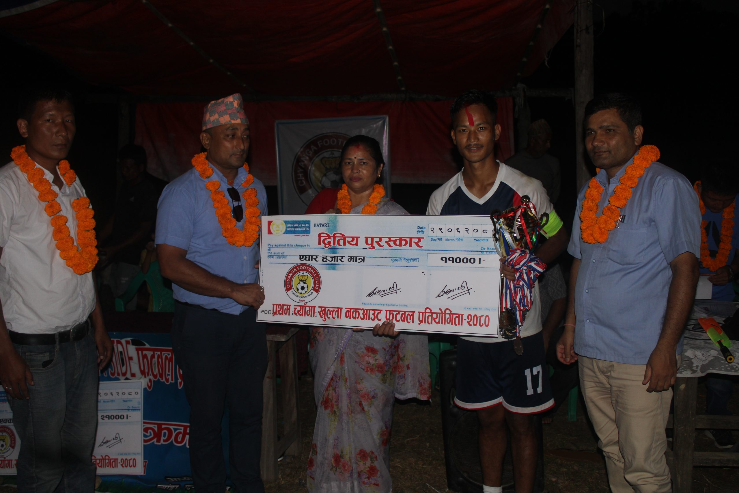 विजयी टिमलाई प्रतियोगिताको समापन समारोहका प्रमुख अतिथि कटारी नगरपालिकाका प्रमुख मेयर राजेशचन्द्र श्रेष्ठ , विशेष अतिथि उपप्रमुख उपमेयर गिता खड्का , वडा नम्बर ३ का वडाध्यक्ष पुष्कर खड्का लगायतका अतिथिहरुले पुरस्कार प्रदान गरे । प्रतियोगिताको उत्कृष्ट खेलाडी गणका सरोज श्रेष्ठ , सर्वाधिक गोल कर्ता सगरमाथा फुटबल क्लवका प्रितम धामी , उत्कृष्ट डिफेण्डर च्याँगा फुटबल क्लवका गोपाल लिम्बु , उत्कृष्ट गोलरक्षक च्याँगाकै सुजल गिरी र उदयमान खेलाडी च्याँगाकै श्रवण सुनुवार घोषित भए ।
