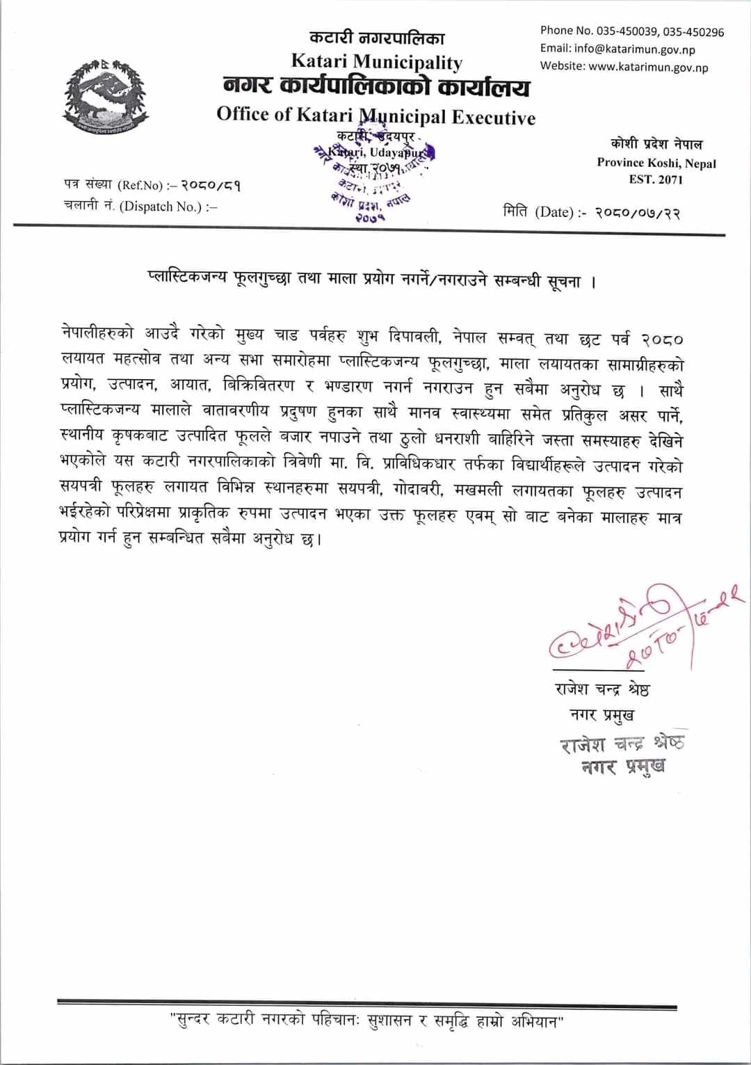 यसै वीच कटारी नगरपालिकाले एक सुचना जारी गर्दै नगरपालिका भित्र प्लाष्टिकजन्य फुलगुच्छा तथा माला प्रयोग नगर्न नगराउन अनुरोध गरेको छ । नगरपालिकाका मेयर राजेशचन्द्र श्रेष्ठ हस्ताक्षरित सूचना जारी गर्दै नगरपालिकाले नजिकिएको चाड तिहार छठ तथा महोत्सव समारोहहरुमा प्लाष्टिकजन्य सामाग्रीहरु प्रयोग , उत्पादन विक्री वितरण भण्डारण नगर्न नगराउन आग्रह गरेको हो ।