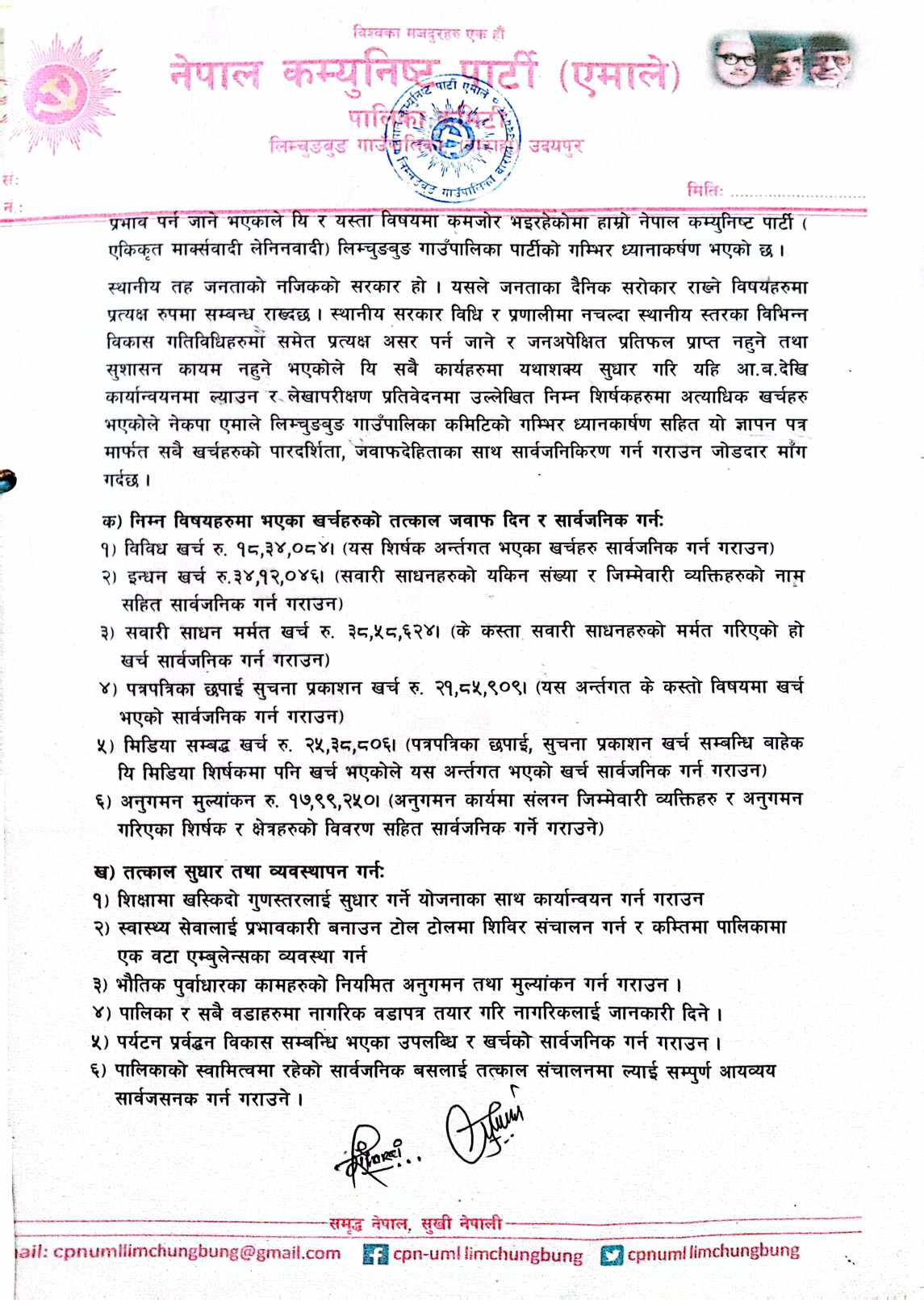 ज्ञापनपत्रमा लेखापरीक्षण प्रतिवेदनमा उल्लेखित निम्न शिर्षकहरुमा अत्याधिक खर्चहरु भएकोले नेकपा एमाले लिम्चुङबुङ गाउँपालिका कमिटिको गम्भिर ध्यानकार्षण सहित यो ज्ञापन पत्र मार्फत सबै खर्चहरुको पारदर्शिता, जवाफदेहिताका साथ सार्वजनिकिरण गर्न गराउन जोडदार माग गरिएको छ ।