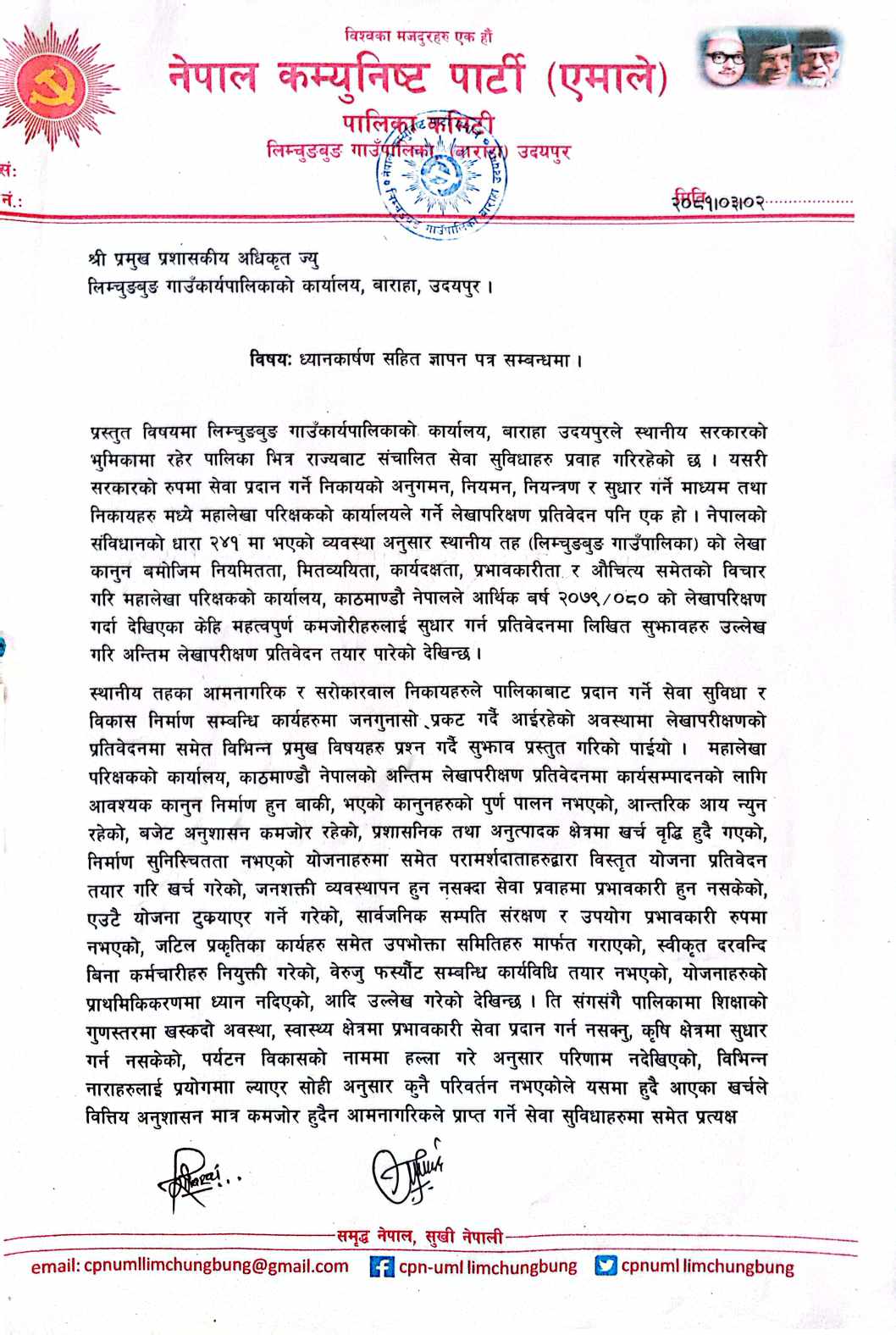 एमाले लिम्चुङबुङ गाउँपालिकाका अध्यक्ष ज्ञान बहादुर राइको नेतृत्वमा प्रमुख प्रशासकीय अधिकृत योगेन्द्र गुरुङलाई आर्थिक बर्ष २०७९÷०८० को महालेखा परिक्षकको प्रतिवेदनले उल्लेख गरेका बिषयहरुमा पालिकाको तर्फबाट प्रष्ट पार्न ज्ञापन पत्र बुझाएको एमाले लिम्चुङबुङले जनाएको छ ।