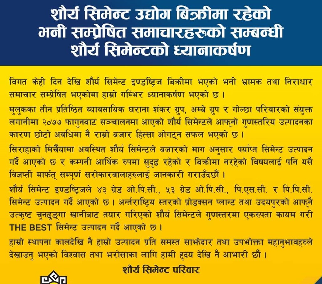 शौर्य सिमेन्ट विक्रीमा रहेको समाचार भ्रामक भन्दै सिमेन्ट उद्योगद्वारा ध्यानाकर्षण