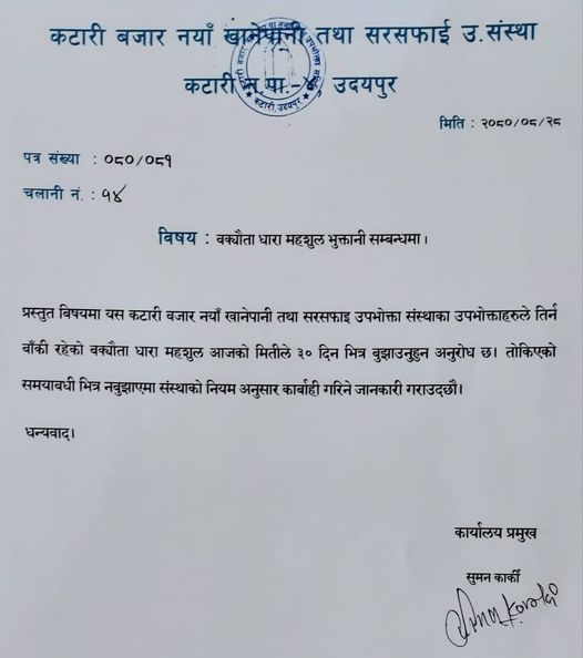 एकमहिना भित्र कटारी खानेपानीको महशुल नबुझाए कार्वाही गरिने